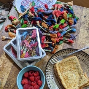 Embroidery is so easily portable, you can keep in next to your bed and wake up with coffee and stitching.