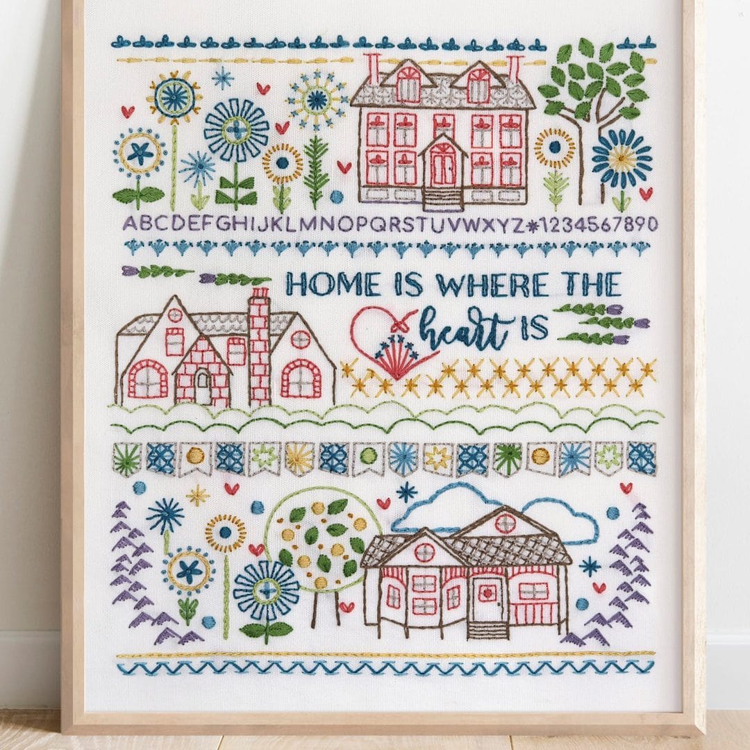 Horizontal borders breaking up the sections of a design are key to our traditional samplers–like Home Sampler shown here.