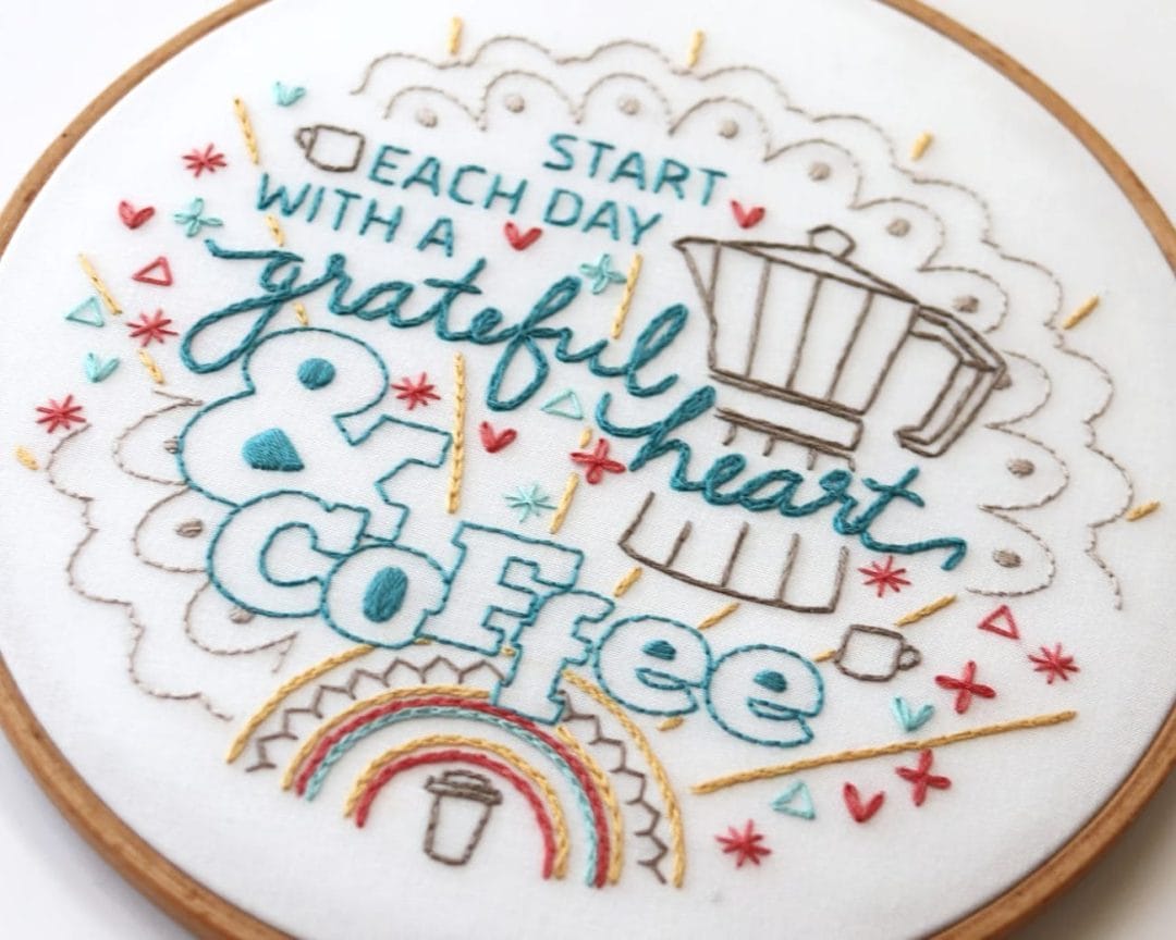 The border on Start with Coffee has scallops like those on a paper doily. The little satin-stitched circles evoke doily openings.