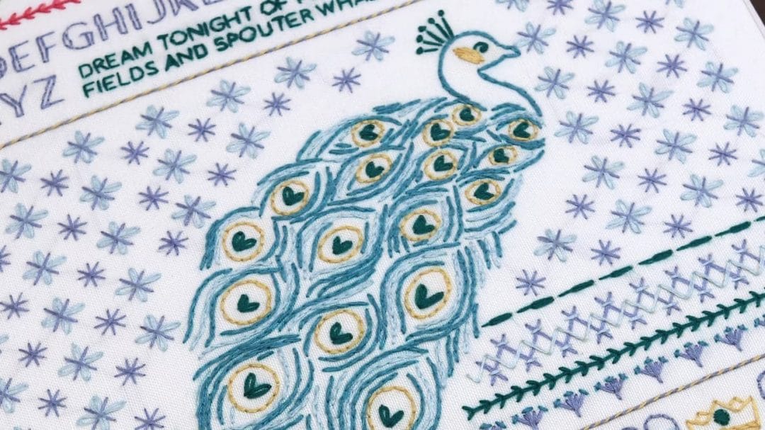 On Peacock Dreams, we’ve embroidered a peacock’s multi-color feathers with lines in either SPLIT or CHAIN stitch (depending on how thick you want them). The center eye outlines LAZY DAISY hearts with BACK stitched circles.