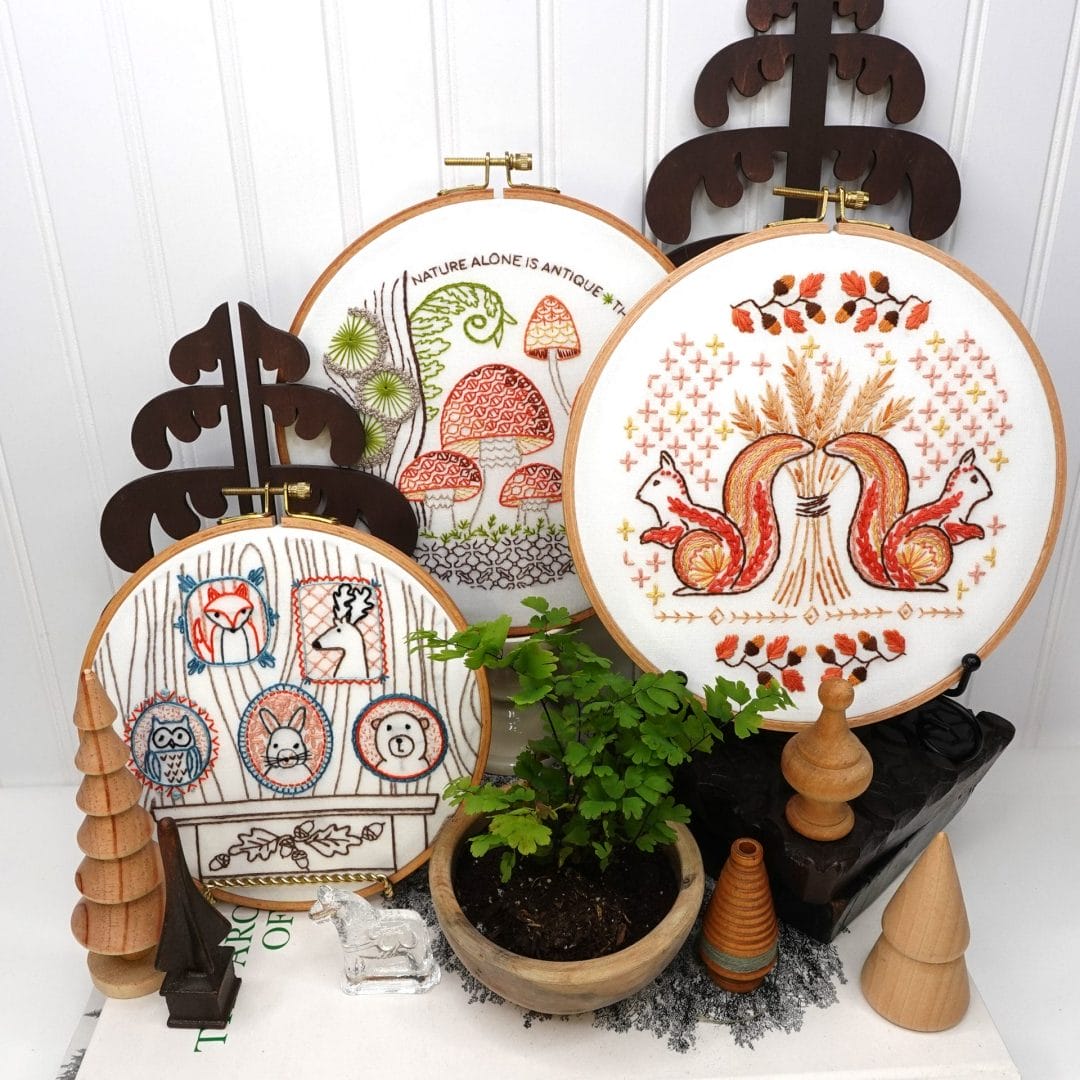 A pair of squirrels, a rogues’ gallery of woodland animals, mushrooms under fiddlehead ferns–Squirrels & Acorns, Rogues’ Gallery, and Mushrooms are filled with motifs that feel like folklore stitched in thread.