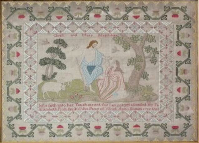 Alphabets were stitched alongside Bible verses, with imagery evoking stories like Adam & Eve, Noah’s Ark, or The Good Shepherd. These moral tales were meant to be remembered and retold, and a stitched record helped fix them in memory.