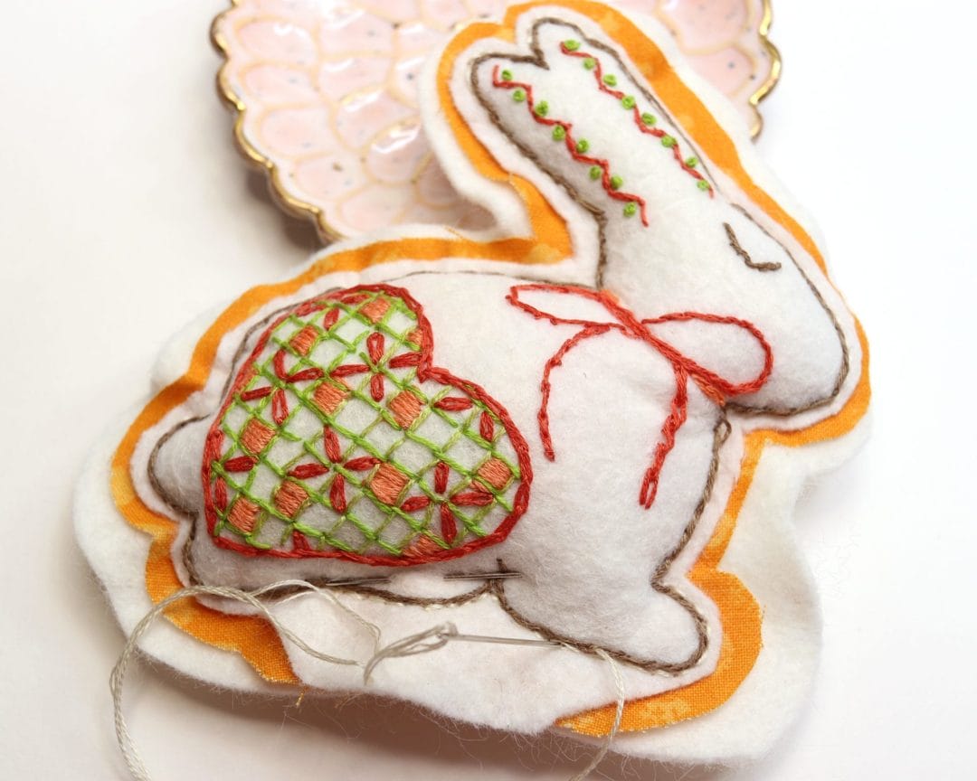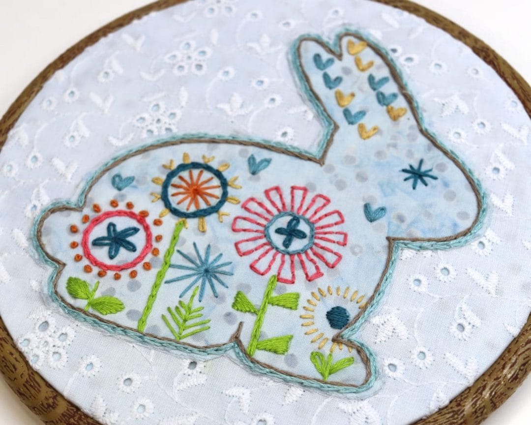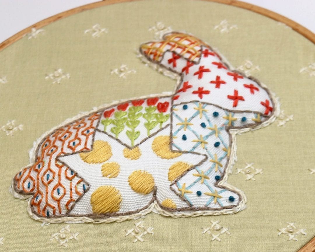 Using a floss color that matches the patterned fabric, chain stitch around the bunny catching and hiding the raw edge of the trimmed fabric.